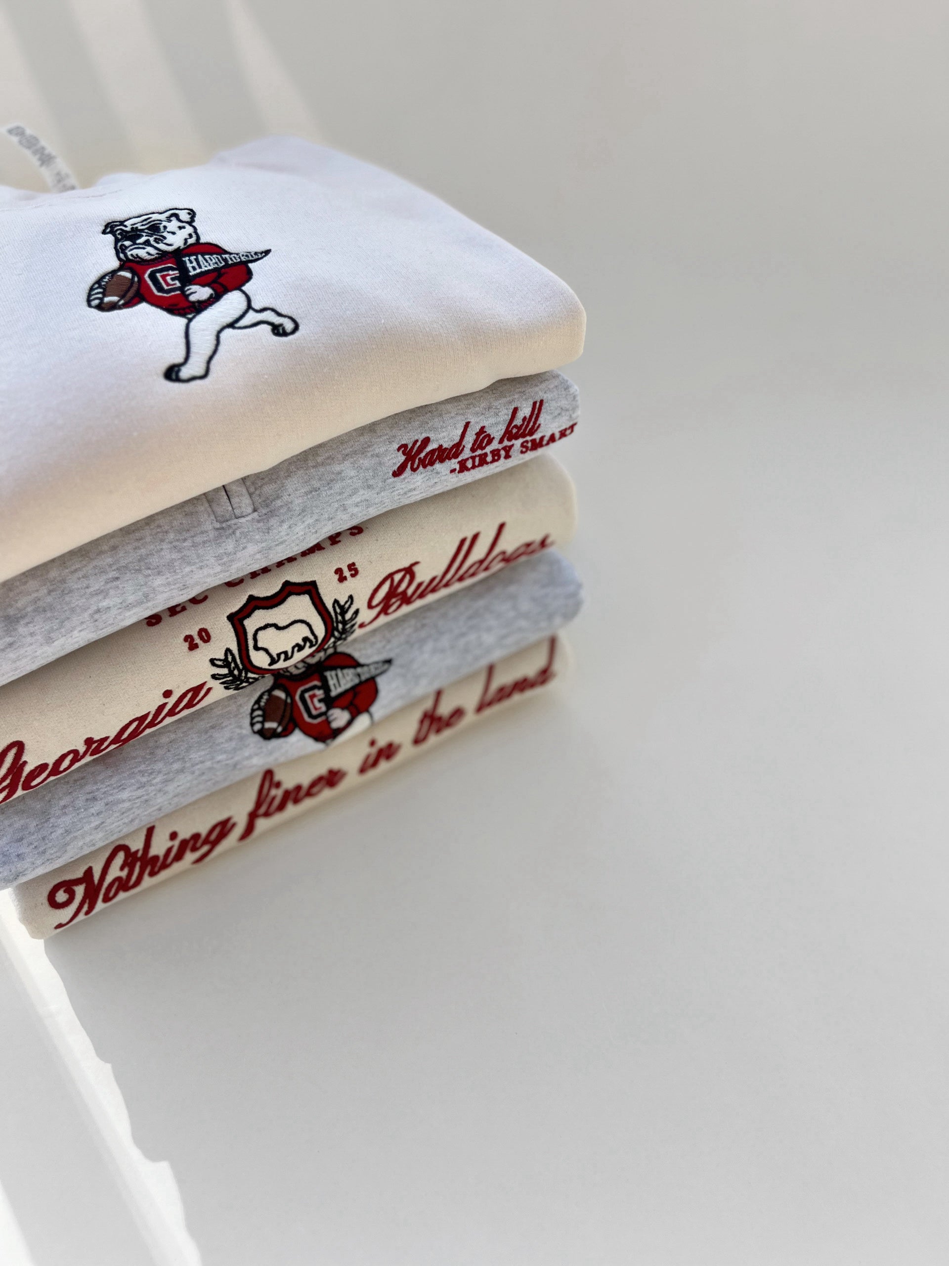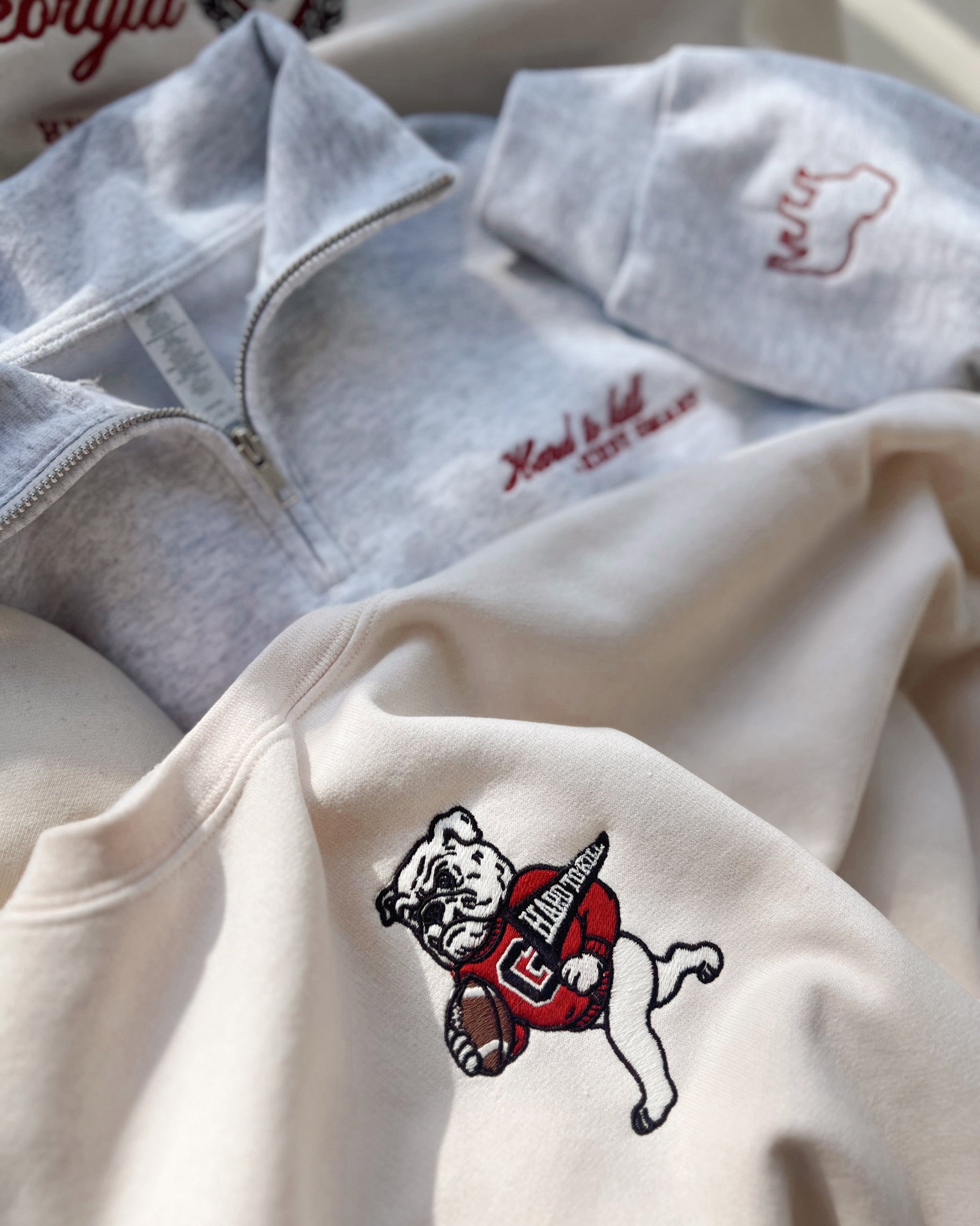 Crewnecks have the design in the middle of the chest and quarter zip is on the right chest.